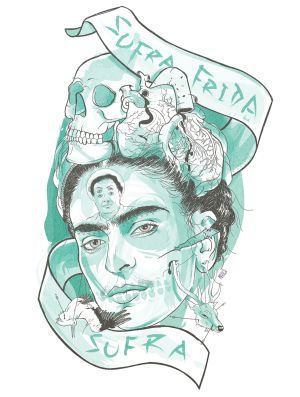 En sus dibujos es posible apreciar el lado más íntimo de estrellas de la música, la pintura o el cine. Cada obra exige unos minutos de observación para entender qué se esconde detrás ella. Por ejemplo, al retrato de Frida Kahlo, la gran sufrida del arte mexicano, le cuelgan de las orejas un reno y un pájaro; de sus cabellos un corazón y una calavera; y en la frente, Diego Rivera, que siempre estuvo presente en su vida. “Me encanta Frida. Además de la estética que tiene y del modo de expresarse. Lo que más me gusta de ella es que todo su arte parte de autorretratos. Me fascina el modo que tiene de expresarse. Soy totalmente fanático de cómo en los dibujos representa sus sentimientos con elementos relativamente básicos”, explica Matu, que expuso este poster titulado Sufra Frida, sufra en la web del club de fans de la artista.